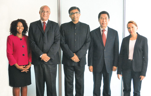 当地时间6月10日下午,第四届金砖国家知识产权局局长会议在巴西里约热内卢开幕。申长雨(右二)、阿德米尔·塔德里(左二)、柳波芙·基里(右一)、拉吉夫·阿戈瓦尔(右三)与诺蒙德·迈梅拉出席会议。