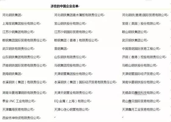 根据上表可知,此次涉案的中国企业来自全国各地,几乎网罗了中国所有的钢铁巨头和主要生产力。